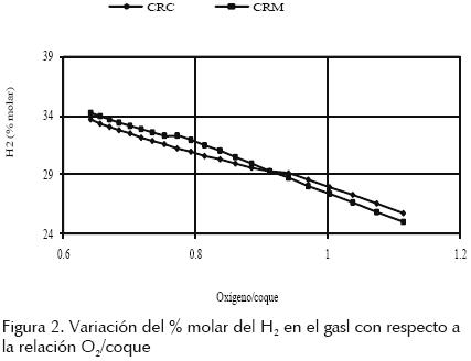 En la relación 0.94 el contenido de H2 para el CRC es de 29.13% molar y para el CRM de 28.73% molar (figura 2). La composición de CO e H2 para el CRC se considera una composición máxima alcanzada en la relación oxigeno/coque de 0.940.