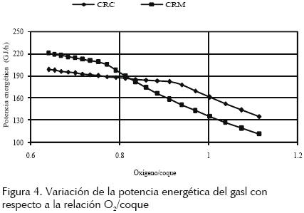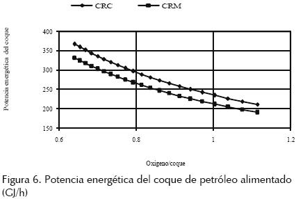 En la relación oxígeno/coque de 0.94 el poder calorífico del gasl es de 13438.756 kJ/kggasl para el CRC y de 12406.975 kJ/kg de gasl del CRM con una diferencia de 1031.78 kJ por cada kg de gasl producido. La potencia energética del gasl se tiene 178.019 GJ/h para el CRC y 150.453 GJ/h para el CRM, es decir, la potencia energética del CRC es mayor en 27.566 GJ/h, con respecto a la potencia energética del CRM. Por consiguiente, para iguales condiciones de alimentación de coque de 6418.304 kg/h al gasificar el CRC se obtiene un incremento de energía de 4295 kJ por cada kg de coque gasificado (figuras 3 y 4). En esta relación oxígeno/coque de 0.94 el CRC produce 2.23826 kggasl/kgcoque, mientras que para la gasificación del CRM se producen 2.04897 kggasl/kgcoque.