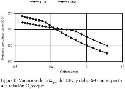 Cuando la relación oxígeno/coque se reduce de 0.940 a 0.77 correspondiente a un incremento en la alimentación de coque de 6418.304 kg/h a 7818.304 kg/h la potencia energética del gasc (Ωgasc) del CRC se incrementa 15 GJ/h de 192.78 GJ/h a 207.6, mientras que la potencia energética del gasc (Ωgasc) del CRM se incrementa 55.66 GJ/h de 164.91 a 220.57 GJ/h, asimismo, la potencia energética del vapor saturado (Ωvapor) del CRC varia de 15.52 GJ/h a 15.94 GJ/h y la del CRM de 15.60 GJ/h a 16.63 GJ/h durante el intervalo considerado (figuras (7) 8 y 9).