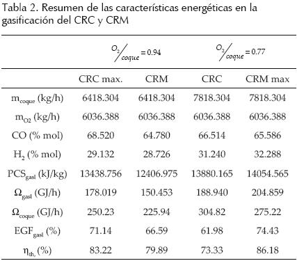Las relaciones oxígeno/coque de 0.94 y 0.77 son las relaciones donde el CRC y el CRM, respectivamente, alcanzan su máxima eficiencia térmica con un valor de 83.22% y 86.18%, la primera para una alimentación de coque CRC de 6418.304 kg/h y la segunda para una alimentación de coque de CRM de 7818.304 kg/h.