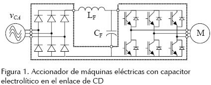 En la figura 1 se muestra el diagrama de un accionador de máquinas eléctricas con un rectificador no controlado como etapa de entrada, un inversor trifásico como etapa de salida y un filtro LC pasabajas en el enlace de CD. Una fuente de preocupación es el capacitor electrolítico: la corriente a través de él incluye armónicas producidas tanto por el rectificador como por el inversor. La temperatura interna aumenta, debido al flujo de corriente sobre la resistencia equivalente en serie (ESR), lo que degrada las características del capacitor y acorta la vida útil (Sarjeant et al., 2001). Para alargarla se han seguido diferentes enfoques. Uno consiste en reducir el valor del capacitor a valores tan pequeños que sea posible utilizar elementos de película o de cerámica. Si bien la viabilidad ha quedado demostrada, el enfoque exige el empleo de un rectificador activo como primera etapa (Chien et al., 1998). De hecho, puede eliminarse completamente el capacitor, aunque a costa de un rizado muy elevado en la tensión en el enlace (Piepenbreier et al., 2004); además de la obvia complejidad por la circuitería extra, estos convertidores son muy sensibles a los transitorios (Klimpner et al., 2004), y los desequilibrios en la tensión trifásica de entrada generan un rizado a frecuencia del doble de la de línea, lo que interfiere con la carga e impone restricciones muy severas en el control (Hwang et al, 2007).
