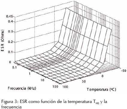 La potencia Pc depende de la ESR y de la corriente ic que fluye a través del capacitor. La ESR exhibe un comportamiento alineal, como puede apreciarse en la figura 3, la que corresponde a un capacitor electrolítico de 4700 μF a 450 V. La ESR también depende, de forma inversamente proporcional, del valor de capacitancia y de VR.
