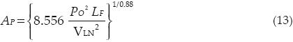 donde Bm es la densidad de flujo magnético, la constante KU es el factor de utilización de la ventana y KJ depende del incremento de temperatura en el inductor (McLyman, 1988). La energía que debe manejar LF depende de la potencia nominal PO de la carga y de la tensión línea a neutro VLN a la entrada del rectificador: