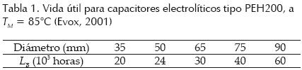 donde LB es la vida útil nominal a la temperatura interna máxima TM, y depende del diámetro del capacitor, como se aprecia en la tabla 1.