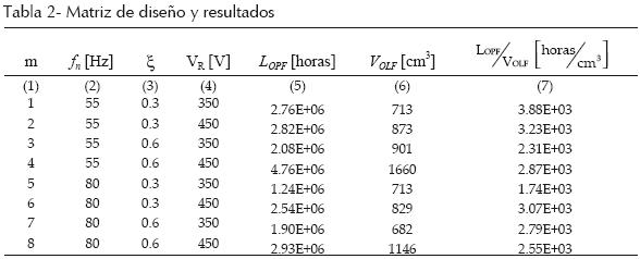 El efecto de fc sobre el cociente LOPF/VOFL, es evidente en la tabla 2 (compárense las combinaciones 1, 2 y 4 con las 5, 6 y 8, respectivamente). Se aprecia también que el cociente para la combinación 3 (a 55 Hz) es menor que el de la 7 (a 80 Hz). Debe notarse que los volúmenes, tanto de los capacitores como de los inductores, cambien a pasos y no de manera continua en función del valor del elemento. Para el caso de los inductores, una laminación de dimensiones dadas permite construirlos dentro de un intervalo LMAX > LF > LMIN y se obtiene una mayor eficiencia volumétrica si LF ≈ LMAX. Lo mismo ocurre con los capacitores, y el efecto se extiende también a la vida útil nominal LB asociada con las dimensiones del empaque. En el caso de las combinaciones 3 y 7, para maximizar el cociente LOPF/VOFL puede aprovecharse el efecto principal de ξ. Al reducirse este factor se obtiene un capacitor más pequeño, a costa de un inductor más voluminoso; el resultado se aprecia comparando la columna 3 con la 1, o la 4 con la 2.