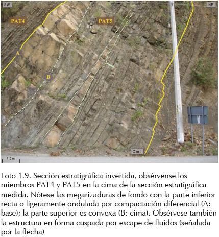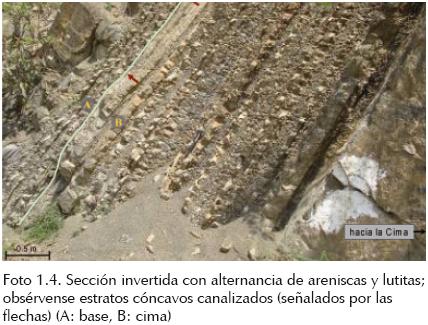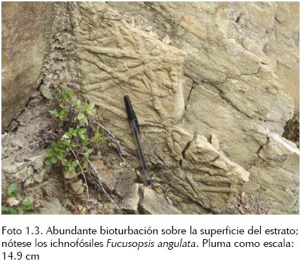 Este afloramiento es la base de la columna estratigráfica medida con un espesor de 6.85 m que está invertida en dirección hacia el NE 40° con una inclinación de 50° (Foto 1.1). Litológicamente está formada por intercalaciones de capas gruesas y medianas de areniscas de grano fino, color gris claro y ocre por intemperismo; los estratos varían en espesor entre 0.85 m a 1.0 m y están interestratificados con capas delgadas de areniscas limosas y limos arcillosos de entre 10 y 12 cm de espesor. Todas las capas presentan adelgazamientos laterales y las láminas texturalmente más finas están altamente bioturbadas observándose ichnofósiles del género Megagrapton irregulare (?) (foto 1.2) y Fucusopsis angulata (foto 1.3).