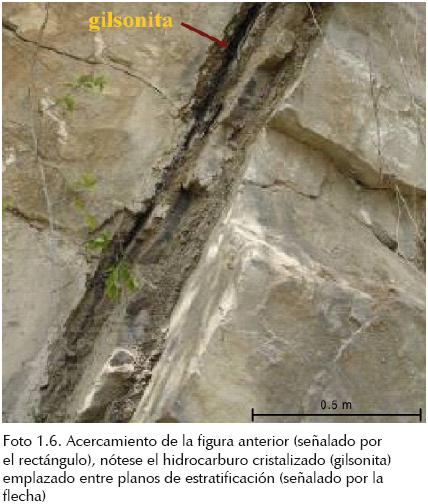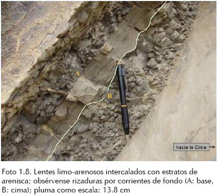 En la parte superior de la secuencia, las areniscas tienen hasta 40 cm de espesor, dentro de las cuales se observan pequeñas laminaciones paralelas de 2 a 5 mm, presentando estos horizontes finos entre 8 y 10 cm de espesor; también se tiene la presencia de una estructura en forma cuspada, debido al escape de fluidos (foto 1.9).