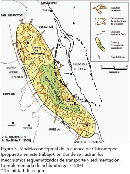 Los sedimentos terrígenos de la Formación Chicontepec, son consecuencia del levantamiento tectónico y la erosión de las rocas de la Sierra Madre Oriental, ocurrido durante el Cretácico tardío hasta el Paleógeno temprano; de la paleoisla de Tuxpan al oriente y del macizo de Teziutlán al sur; con el consecuente transporte y depósito de los sedimentos resultantes en franca progradación hacia el interior de la cuenca y del paleocanal de Chicontepec, como sistemas turbidíticos marinos y profundos (figura 3).