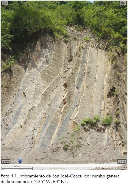El afloramiento tiene un espesor de 46.25 m con un rumbo general de la secuencia NW 36° SE, 61° SW.