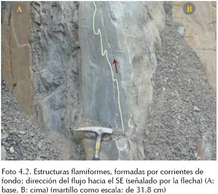 La columna presenta estructuras sedimentarias primarias, debidas a corrientes de fondo, tales como "flute casts" y megarrizaduras, así como estructuras de arrastre de partículas: "groove", "prood" y "bonce casts" (Foto 1.3); todas ellas orientadas hacia el SE 35°, transversales a la dirección del transporte másico sedimentario que tiene una dirección preferencial hacia el NE 40°.