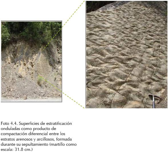 Otras estructuras presentes sobre la superficie de estratificación, son las de carga, que observadas de canto o perfil muestran un asentamiento diferencial de las areniscas sobre las arcillas (foto 4.3) y se manifiestan en las areniscas como superficies alabeadas y onduladas (foto 4.4).