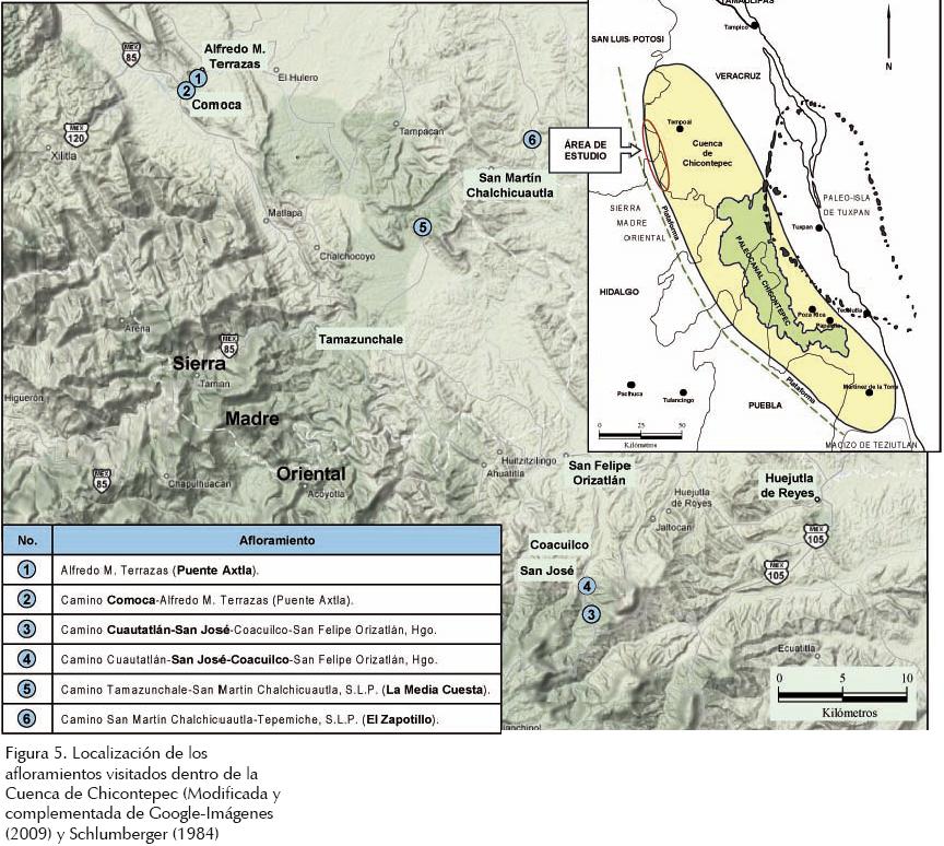 Los accesos a los sitios de los afloramientos estudiados, inicialmente son por las carreteras federales número 85 (MéxicoCd. Valles, SLP) y 105 (PachucaMolangoHuautla de Juárez Hgo.); posteriormente por los caminos vecinales que conectan a los poblados de CuatatlánSan Felipe Orizatlán, Hgo.TamazunchaleAlfredo M. Terrazas SLP y otros circunvecinos. Los sitios de los afloramientos visitados dentro de la Cuenca de Chicontepec se muestran en la figura 5.