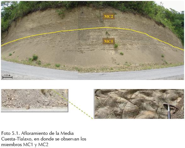 Con un espesor medido de 4.06 m, en cuya base se encuentran estratos de areniscas de grano medio a fino, en espesores que varían entre 3 y 15 cm, intercalados con limonitas y lutitas de 2 a 3 cm de espesor. Se observan zonas de derrumbes y deslizamientos intraformacionales (pliegues convolutos: "décollement") hacia el NE con espesor de 40 cm (foto 3.1). Los estratos encajonantes presentan acuñamientos y truncamientos.