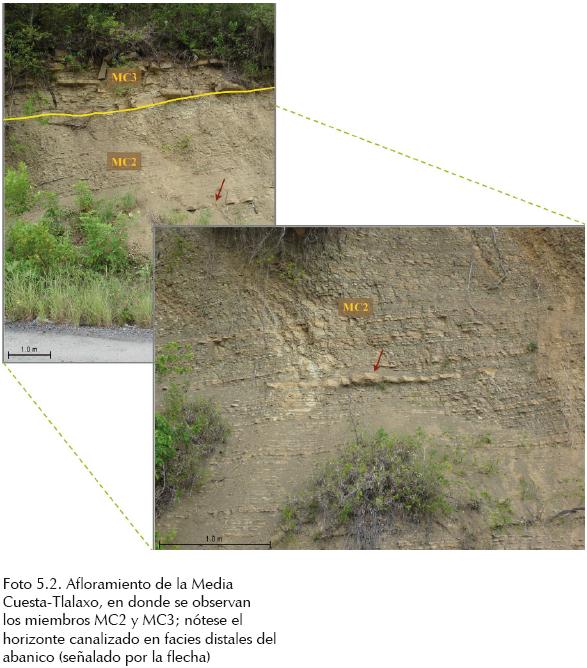 Hacia la parte superior de la unidad estratigráfica dentro de la secuencia con estratificación delgada y de granulometría fina, se observan zonas canalizadas discretas, representadas por estratos de arenisca de grano medio de 10 cm de espesor por 2.10 m de ancho en promedio, los cuales corresponden a lentes lobulares dentro de la facie distal del abanico (foto 5.2).