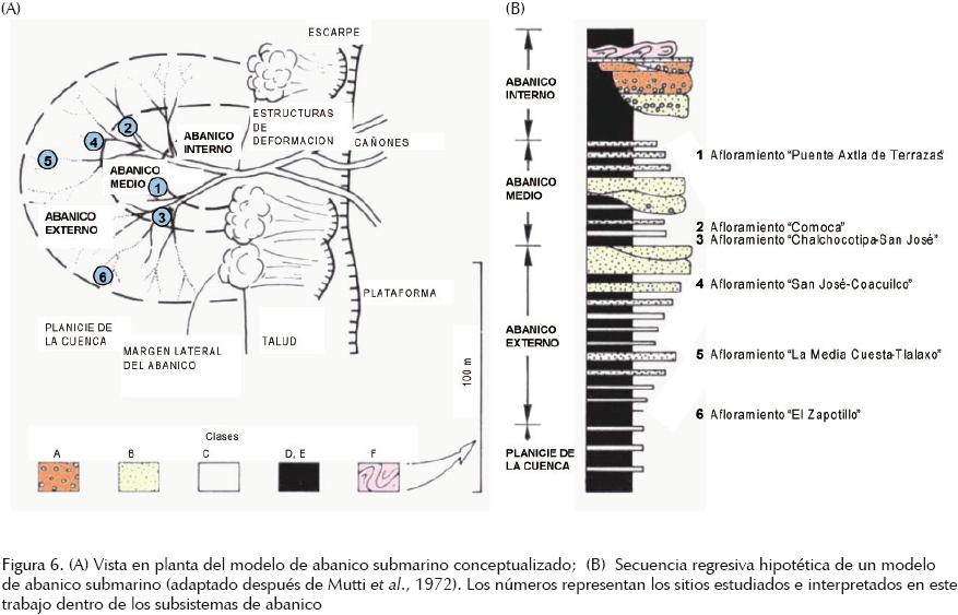 En la figura 6, en (A) se ilustra en planta el modelo de abanico submarino propuesto por Mutti et al. (1972) y la posición relativa del abanico interno, medio y externo de la planicie de la cuenca, así como las litofacies asociadas a ellos. En (B) se esquematiza una columna regresiva hipotética. Los números indican la ubicación de los sitios estudiados de las secuencias estratigráficas en los afloramientos aislados, caracterizadas e interpretadas en este trabajo como facies turbidíticas de abanico medio y externo de la formación Chicontepec inferior; edad determinada por la posición regional de la unidad estratigráfica dentro de la cuenca.