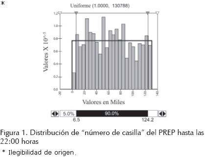 En la figura 1, se observan los datos obtenidos por el PREP hasta las 22:00 horas, mostrando la distribución de los números que se le relacionaron a las casillas y a la distribución uniforme que más se acerca a los datos reales (18,946), ésta se representa por una línea horizontal. El comportamiento real es diferente al de una distribución uniforme.