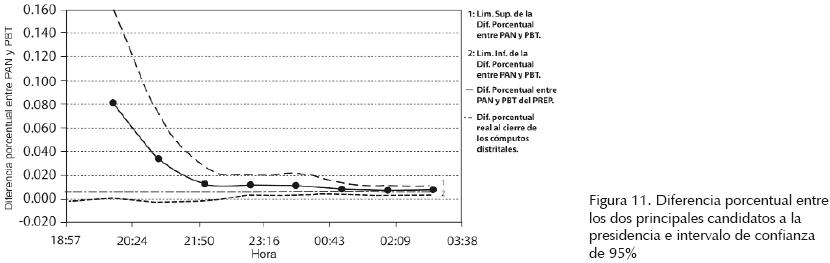 En la figura 11 se muestra la diferencia porcentual entre los dos principales candidatos a la presidencia de la República, con el intervalo de confianza considerando los 30 procedimientos realizados para el conteo rápido, esto con una estimación de confianza de 95%; y con una línea horizontal punteada la diferencia real al cierre de los cómputos distritales. Se observa que hasta las 22:00 horas el intervalo de confianza de 95% cae en diferencias negativas, lo que da a entender que hasta esa hora aun no se definía un ganador. Hasta las 23:00 horas existe una tendencia del intervalo de confianza de caer en diferencias positivas, y ya que se ha trabajado sobre una muestra aleatoria de las casillas electorales que fueron instaladas el 2 de julio de 2006, se concluye que a la hora mencionada tenemos un ganador para la candidatura a presidencia de la República Mexicana.