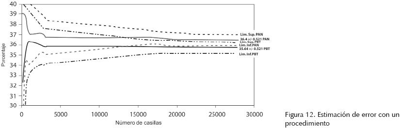 En la figura 12 se muestra el nivel de confianza de 95% para un procedimiento. Debe notarse que a diferencia de los 30 procedimientos, el error porcentual aumenta a 0.52% + 0.52% = 1.04%, ya que se considera la suma del error de los dos candidatos políticos; esto con 27,858 casillas contabilizadas a las 3:00 horas del 3 de julio de 2006.