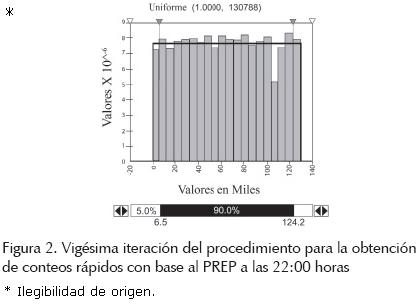 La figura 2 muestra la vigésima iteración que consta de 3,045 datos. Existe mejoría, tanto gráficamente como en los valores teóricos; sin embargo, aún no se alcanzan valores aceptables para afirmar que la distribución de los datos corresponde a una distribución uniforme, es decir, no se puede obtener una muestra de datos aceptable para el conteo rápido. La figura 3 muestra la cuadragésima y última iteración que consta de 985 número de casillas, en la cual se cumple con el criterio de uniformidad; sin embargo, hay que notar que el número de casillas final no es estadísticamente representativo para una estimación de +/ 0. 292% con error de 95% de confiabilidad y una población de 130,831 datos.
