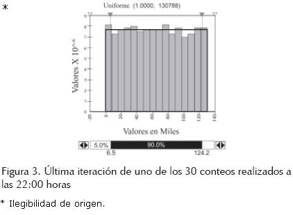 En la figura 1 se muestra que a las 22:00 horas la distribución inicial cuenta con 18,946 datos y la distribución uniforme que más se acopla a los datos reales no tienen mucha significancia.