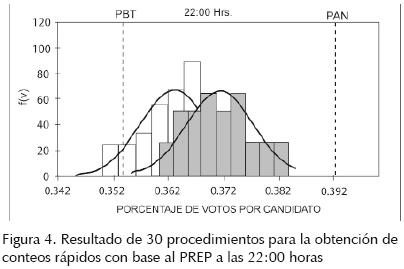 La figura 4 muestra la distribución del porcentaje de votación de los dos principales candidatos políticos a la presidencia de la República, uno postulado por el Partido Acción Nacional (PAN) y el otro por la Coalición por el Bien de Todos (PBT) obtenidos por 30 conteos rápidos, considerando que se cumple la condición de uniformidad y teniendo un promedio de 984 datos; también se muestra el porcentaje de votos alcanzado en el PREP a las 22:00 horas por los dos principales competidores a la presidencia de la República Mexicana.