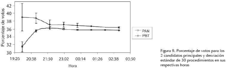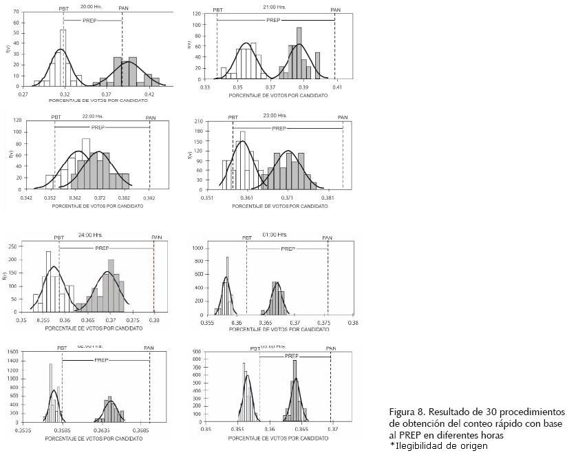 En la figura 8 se muestra el resultado de los 30 procedimientos de conteos rápidos realizados con los datos del PREP a partir de las 20:00 horas y para cada hora, terminando a las 3:00 horas del día siguiente.