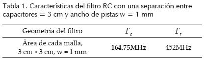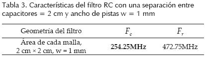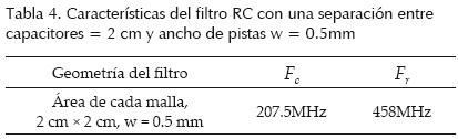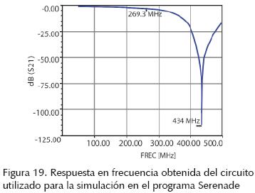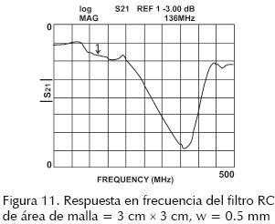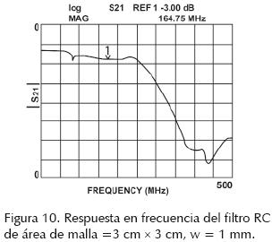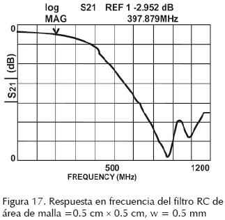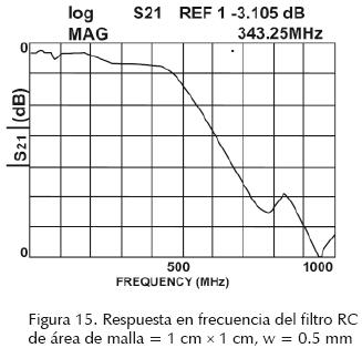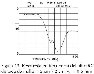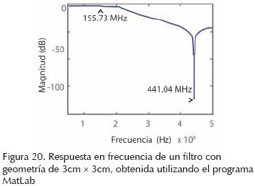 La solución de las ecuaciones correspondientes al circuito que se muestra en la figura 18 se resolvieron en Uribe (2006) con el programa MatLab. La función de transferencia obtenida se muestra a continuación en la gráfica de la figura 20. En este caso, se utilizó un filtro con geometría de 3cm × 3cm.