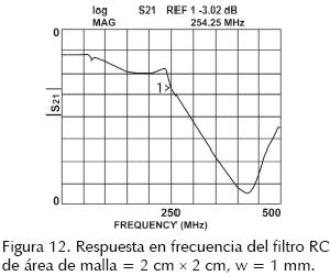 Como puede observarse en la gráfica de la figura 6, existe un corrimiento en la frecuencia de corte medida con respecto a la calculada (372.9MHz) (Uribe et al., 2006), así como efectos resonantes debidos al intercambio de energía de un inductor con un capacitor como se muestra en la figura 7.