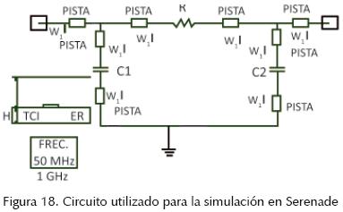 Los programas de simulación que se utilizaron fueron dos: uno desarrollado en códigos de MatLab utilizando una interfaz gráfica, la cual por medio de las longitudes físicas de las pistas y valores de los componentes utilizados calcula las capacitancias mutuas e inductancias propias y mutuas del circuito eléctrico propuesto. El otro programa utilizado fue el Serenade, que utiliza segmentos de pistas de TCI donde solamente se tiene que especificar el ancho y la longitud de la pista, así como las características del material dieléctrico que utiliza la tarjeta de circuito impreso, como se muestra en la figura 18.