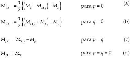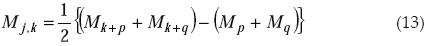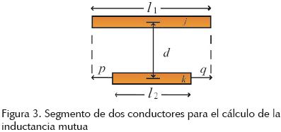 Considerando los segmentos de los conductores mostrados en la figura 3, j y k corresponden a los índices del conductor, p y q a los índices de la longitud que complementa la diferencia de un conductor respecto al otro. La inductancia mutua de los conductores j y k en la configuración de la figura 3 es: