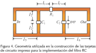 Los elementos que componen el filtro RC son dos capacitores del mismo valor denominados como Celemento y R2 es la resistencia de valor igual a 10 Ohms. Los elementos R1 y R3 son las resistencias que presentan las impedancias características de entrada de los equipos de medición, L4 y L5 son las inductancias mutuas del circuito y L1, L2 y L3 corresponden a las inductancias propias del circuito.