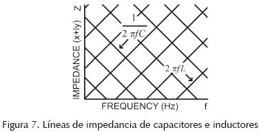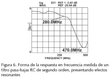 En Uribe (2005), se realizó un estudio de los efectos inductivos del filtro pasabajas RC de segundo orden mostrado en la figura 5b. En la parte experimental se observó que la respuesta en frecuencia del filtro no es de la forma que se muestra en la figura 5b sino que presenta efectos resonantes como se muestra en la figura 6.