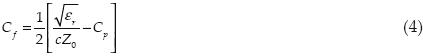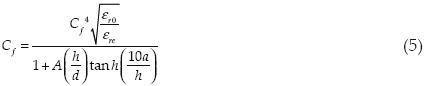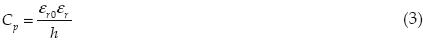donde Cp, Cf, Cf,, representan las capacitancias de placas paralelas y las capacitancias de los perfiles de las pistas que forman la estructura. El cálculo de la capacitancia mutua se obtiene sustituyendo los valores de las constantes que se pueden observar en la figura 1.
