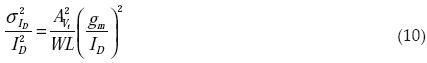 En principio, (10) definiría la varianza de la corriente de un transistor MOS en un amplio rango de polarización que incluye inversión débil, por lo tanto, Pelgrom sería continuo ¿Pero (10) es una expresión adecuada para