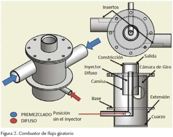 Los experimentos se llevaron a cabo en un combustor de 100 kW, el cual es una versión reducida de un combustor de flujo giratorio de 2 MW de potencia (figura 2). Se usaron dos entradas tangenciales junto con unos insertos de bloqueo de aire, cuya área era 25% del área total de las entradas de flujo. Para la salida se utilizó una construcción angular, presentando un Sg de 0.88.