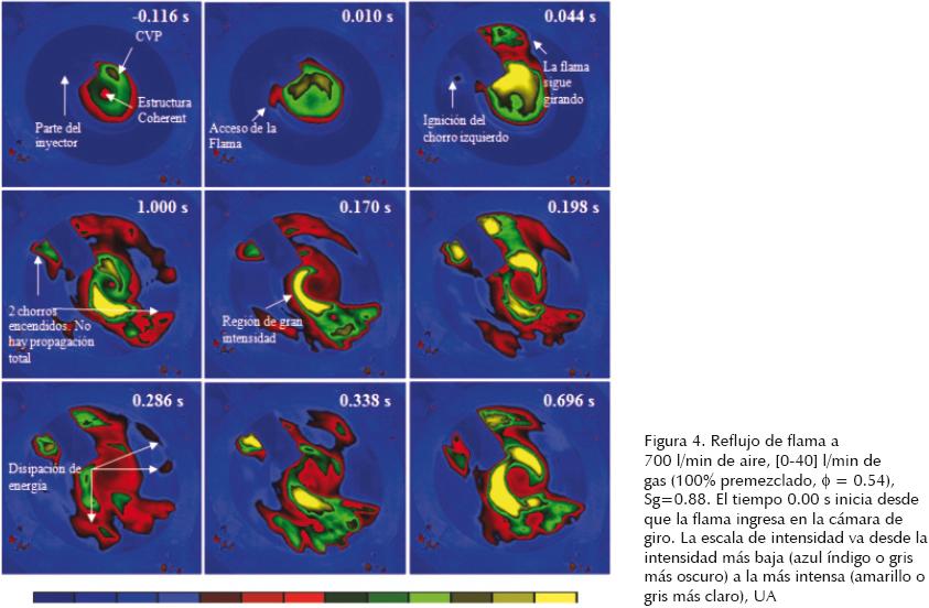 A modo de poder observar el fenómeno que ocurre dentro del combustor, el fondo del mismo se reemplazó por un plato de cuarzo, como se mencionó previamente. Los primeros experimentos se realizaron sin el inyector difuso central. Inicialmente el sistema se operó a l/min, Φ = 0.88. Después de estabilizar el sistema, la inyección difusa se cortó, dejando solamente la premezclada con un Φ = 0.54. Los eventos dentro del sistema se grabaron desde el fondo a través del cuarzo y usando los espejos para evitar daños al equipo. Al iniciarse el reflujo, varios vórtices aparecen en el centro de la flama junto con lo que parece ser un Centro de Vórtice Precesor (Navaert et al., 2007; Sarpkaya, 1971) obsérvese en la figura 4 la imagen a 0.116 s. Estas estructuras inicialmente se desarrollan con el reflujo y después se colapsan mientras la flama se mueve rápidamente de manera radial hacia las paredes de la cámara, alcanzando las entradas de combustible, el cual se enciende mientras la flama sigue moviéndose alrededor de la cámara.
