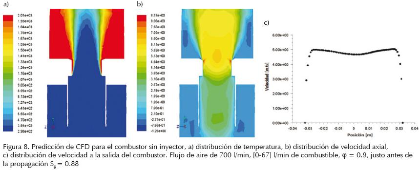 La distribución de velocidad axial sin el inyector (figura 8a), muestra que no existe ninguna ZCR antes de la propagación, lo cual ya había sido validado previamente (Valera, 2009). Se observa como la flama se extiende a través de la camisa por medio de una muy delgada capa límite anular (figura 8b). La figura 8c muestra el perfil de velocidades totales a la salida del combustor; de estos datos se puede obtener el valor de gf, el cual es de 2,900 s1 en la zona anexa a la pared.