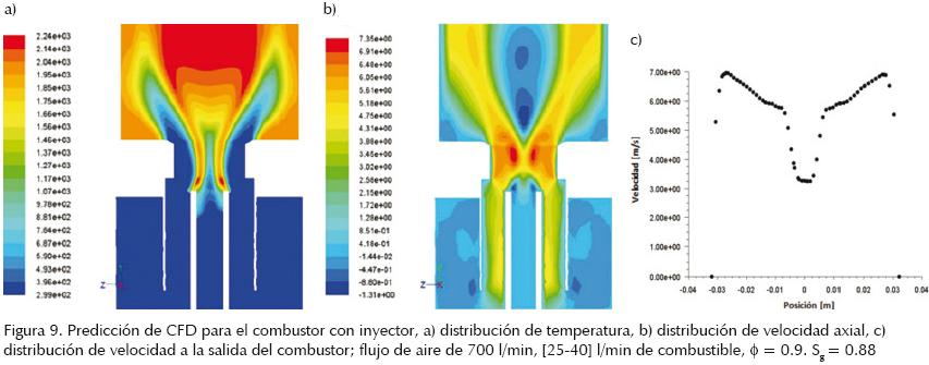El uso de CFD en el análisis de la aerodinámica de combustión se implementó para determinar el comportamiento del sistema en condiciones justo antes de la propagación de flama. Las figuras 8 y 9 muestran los resultados. Este análisis corresponde a los casos con y sin inyector con flujos de aire de 700 l/min. La figura 8a muestra el sistema sin el inyector y a través de distribución de temperaturas se esquematiza la localización de la flama. Los resultados fueron validados experimentalmente.