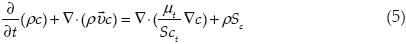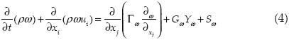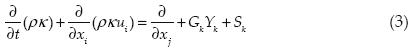 El modelo de turbulencia utilizado fue el modelo estándar κω basado en el modelo de Wilcox (Zimont et al., 1998), el cual incorpora modificaciones para los efectos de bajos números de Re, compresibilidad y cortantes. Sus predicciones están muy cercanas a las mediciones de propagación de ondas, mezclado y chorros tridimensionales. Se trata de un modelo empírico basado en las ecuaciones de transporte para energía cinética de turbulencia y disipación específica. Las ecuaciones pueden ser definidas como,