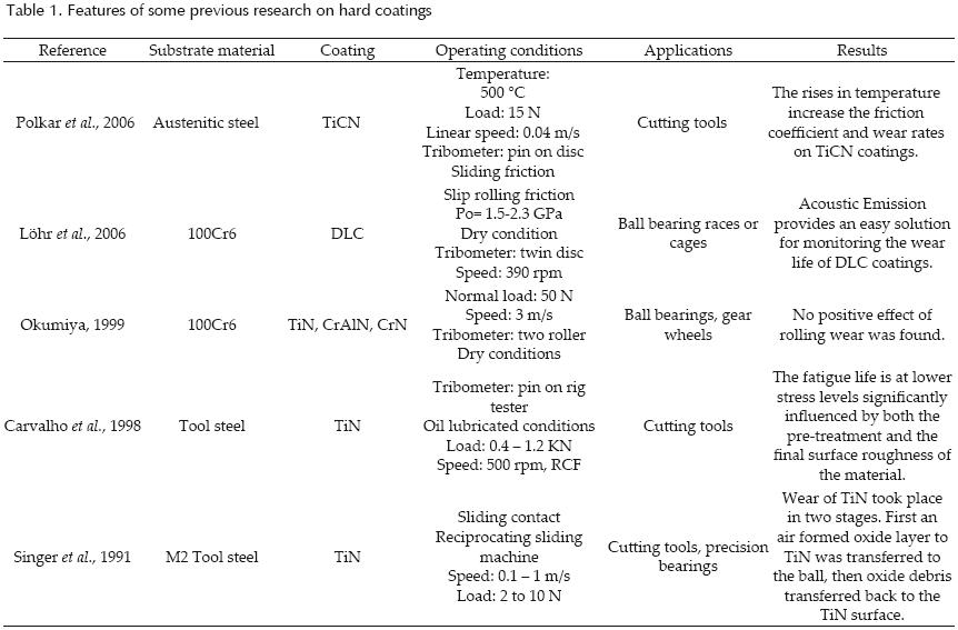 A great deal of research work about sliding wear and friction with coatings involves 100Cr6 (AISI 52100) steel as a substrate material (Srikant et al., 2004). Tungsten carbide coatings have been applied to improve the life of extrusion dies, metrology parts and bearings. The microhardness ranges from 800 to 2100 HV. The properties such as microhardness and stoichiometry are strongly influenced by the deposition parameters (Bhusham et al., 1991). For soft films on hard substrates the load capacity decreases as film thickness increases, while for hard films on soft substrates the converse is true (Arnell et al., 1991). Some of the work carried out associated with the use of hard coatings is shown in table 1.
