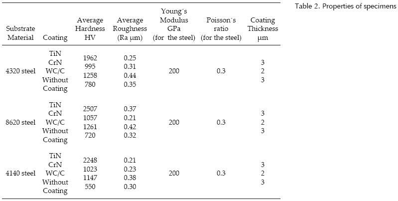The disc specimens have a diameter of 19 mm and a thickness of 3.5 mm. The characteristics of the steel substrates and coatings used are shown in the table 2. A 100Cr6 steelball (diameter 4.75 mm) was used. The coatings were applied by Oerlikon Balzers in Mexico. They were deposited with the PVD technique in a BAI 1200 machine with a high vacuum and at a temperature about 450°C.