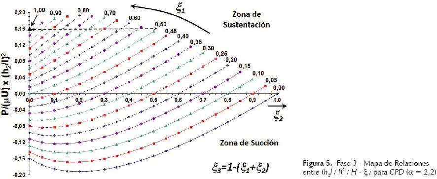 Según la figura 4b, existen configuraciones de MicroCojinetes de 2 Etapas (MC2E) donde el factor (h2 / l)2 / H es mayor que el alcanzable con una configuración de microcuñas 100% convergentes (Configuración A). Estos MC2E son del tipo ConvergentePlano (CP) como el de la configuración D, por ejemplo. A su vez, nótese que la configuración A es mejor que las asociadas a algunos MC2E como lo son aquellos del tipo ConvergenteDivergente CD, en los cuales, ζ2 = ζ4 = 0 (ver gráficas de configuraciones F e I). De todo esto se concluye que, el efecto del achatamiento de las asperezas (configuraciones D y G por ejemplo, comparadas con la configuración A), representado por la zona intermedia de magnitud ζ2, induce cambios representativos en el desempeño de estos elementos, los cuales son benéficos sólo en algunos casos.