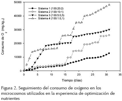 Se observó que a 15°C, en el rango de 10% a 20% de humedad, la producción de CO2 fue de aproximadamente 3000 mgCO2·kg1. Por otro lado, con 3% de humedad y entre 25°C y 37°C, se comprobó que la mineralización de los hidrocarburos produjo aproximadamente 2000 mgCO2·kg1. Los menores valores de mineralización (1000 mgCO2·kg1) se observaron a 5°C y en todo el rango de humedad estudiado, y a 15°C con una humedad comprendida entre 3% y 5%. La bibliografía cita diversas proporciones de nutrientes como las más efectivas para un proceso de biodegradación en suelos (Van Hamme et al., 2003), pero estas proporciones varían ampliamente y las distintas cantidades influyen significativamente en el costo del proceso, no sólo por el precio, sino por su influencia en la velocidad de degradación, lo que implicaría un mayor tiempo de proceso (Chaîneau et al., 2005). A medida que aumentó la concentración de nutrientes en el suelo, disminuyó el consumo de oxígeno, siendo 48124 mgO2·kg1 para el sistema 4, 30077 mgO2·kg1 para el sistema 3 y 25878 mgO2·kg1 y 12712 mgO2·kg1 para los sistemas 2 y 1, respectivamente (figura 2).