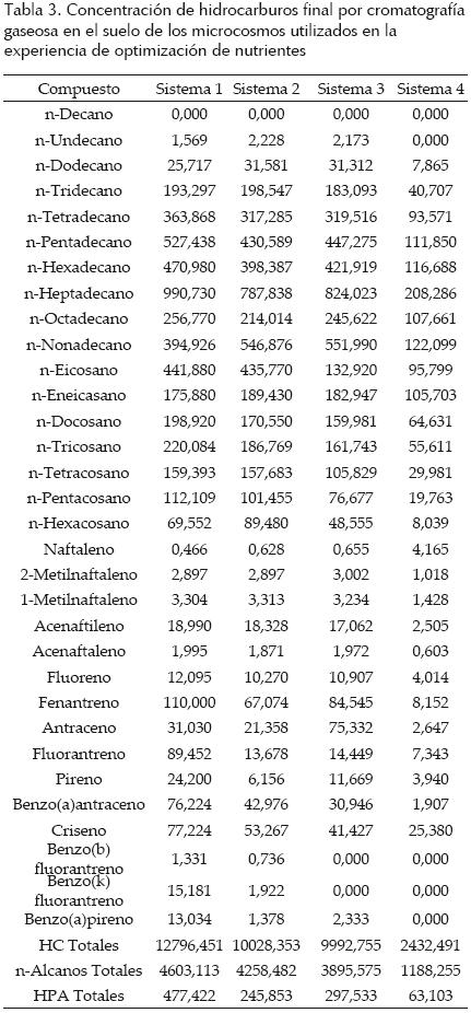 El aumento de nutrientes en el suelo también produjo un alargamiento de la fase de latencia de la comunidad bacteriana presente, capaz de biodegradar hidrocarburos. Con respecto a los hidrocarburos totales, en el sistema 1 se observó un porcentaje de biodegradación de 9%, mientras que en los sistemas 2 y 3, este valor fue 29% para ambos. En el sistema 4, con una relación C:N:P de 100:1:0,1, la biodegradación de los hidrocarburos totales fue 83% (tabla 3). En este sistema se pudo observar que los hidrocarburos nalcanos se eliminaron en 78% y que los HPA en 89% con una buena biodegradación para todos los compuestos determinados. Los suelos de la Patagonia, Argentina, tienen un marcado déficit de nitrógeno y de fósforo y las comunidades bacterianas presentes en estos sitios se encuentran altamente adaptadas a estas condiciones ambientales (Mazzarino et al., 1998). La incorporación de nutrientes en altas concentraciones puede provocar un efecto adverso al deseado, disminuyendo el número de bacterias degradadoras de hidrocarburos o su actividad y por consiguiente, la biodegradación (Chaîneau et al., 2005). En los sistemas 2 y 3, se encontraron valores similares de biodegradación entre 27% y 22% para los nalcanos y 49% a 58% para HPA, encontrándose que los nalcanos se biodegradaron en menor medida a partir de C16 con excepción de neicosano y nhexacosano, en el sistema 3, que fueron biodegradados en 70% y 66%, respectivamente. Con respecto a los HPA, la mayoría se biodegradó en un menor porcentaje, observándose, en ambos sistemas, que acenaftileno y fluoreno fueron muy poco biodegradados. En el sistema 1 los nalcanos totales fueron biodegradados en 16% con un descenso marcado en la biodegradación a partir de C14, los HPA fueron biodegradados en 19%, observándose que sólo los hidrocarburos naftaleno, 2metilnaftaleno, acenaftaleno, fenantreno y benzo(b)fluorantreno fueron biodegradados en un porcentaje mayor a 50%.