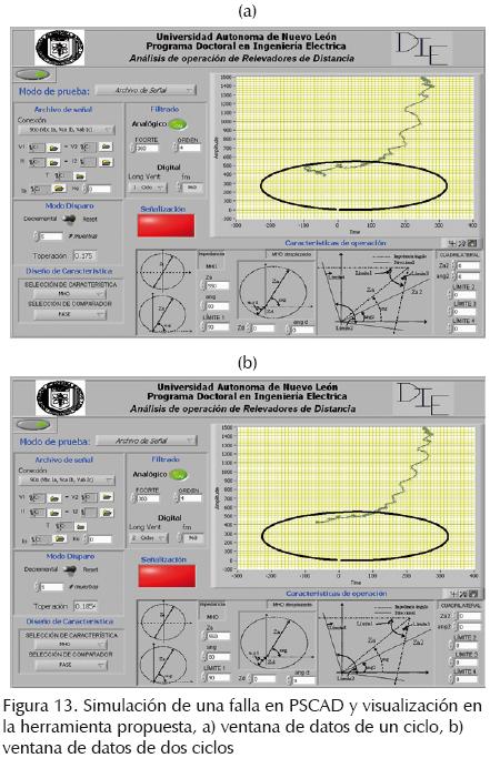 La figura 13 muestra la visualización de la falla trifásica sólida simulada vista por el relevador de distancia, se incluye el efecto del filtro analógico y la ventana de muestreo de un ciclo (figura 13a) y dos ciclos (figura 13b). El efecto del tamaño de la ventana se puede cuantificar en el tiempo de operación, siendo mayor en la ventana de dos ciclos. La falla simulada fue sin resistencia. Diferentes condiciones pueden ser consideradas en la herramienta de simulación para mostrar mediante un análisis visual el efecto de la resistencia de falla en la operación de la protección de distancia, así como el comportamiento con diferentes tipos de características.