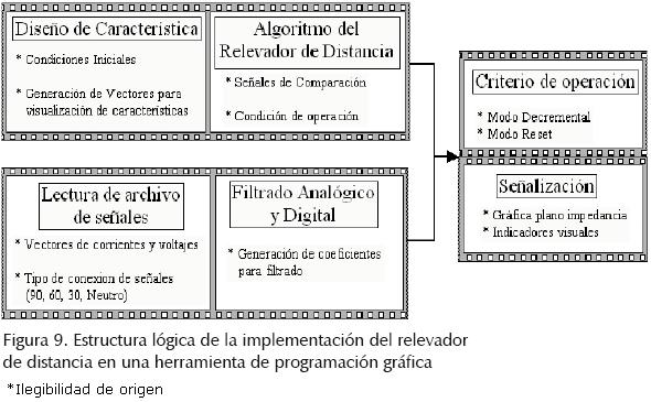 El algoritmo de programación del relevador de distancia se representa mediante el diagrama de flujo de la figura 8. Las etapas de tratamiento digital de las señales de entrada fueron descritas en la sección de tratamiento digital de señales.