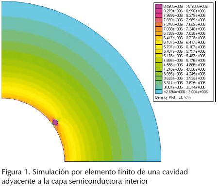 Con el fin de verificar la cantidad de energía presente durante la descarga en una cavidad del tipo esférico, se realizó una simulación por medio de elementos finitos de una cavidad de 1 mm de diámetro en el interior de un aislamiento de 18 mm de espesor de un cable de energía de alta tensión, con aislamiento de Polietileno de cadena cruzada (XLPE), con un conductor de aluminio de 1 x 400 mm2, para una tensión de 76/132 kV. En la figura 1 se muestra el resultado obtenido de la simulación, en donde se aprecia el incremento del gradiente de tensión en la cavidad cercana a la pantalla semiconductora interior, encontrándose que esta energía, antes de que se produzca una descarga parcial, cuando el cable tiene una tensión de 76 kV, se encuentra en un rango que varía de 25,6x105 J a 5,59x105 J, entre la zona de máximo gradiente y mínimo gradiente, respectivamente (Casals, 2008).