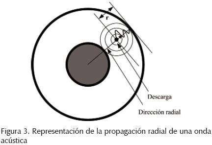 En el interior del empalme en un cable, la descarga parcial se produce siguiendo la dirección radial de máxima variación del campo eléctrico. Esta misma dirección es la más corta en la propagación de las ondas acústicas esféricas, hasta la frontera con un medio diferente al aislamiento, de acuerdo con la representación de la figura 3, donde (r) representa el radio que alcanza en m.