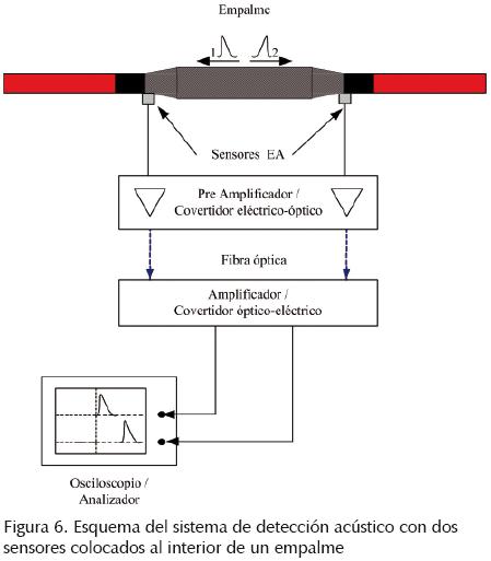 En la figura 7 se muestra la ubicación del sensor EA en la cercanía de un empalme para alta tensión, en donde los componentes del sistema son: el sensor EA, un pre amplificador de banda ancha de 20 kHz a 5000 kHz, convertidor electro óptico, salida por fibra óptica y convertidor ópticoeléctrico.
