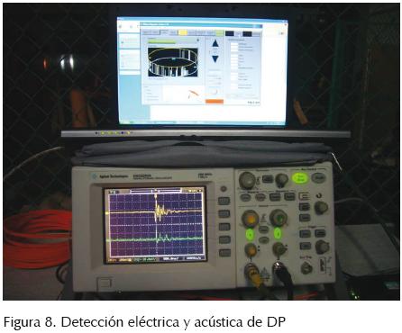 Las detecciones de las DP se realizaron conjuntamente de forma eléctrica por medio de un detector convencional de DP y por medio de sensores EA. La detección eléctrica nos permitió obtener las magnitudes de descarga en pC y verificar que el sistema acústico detecta la presencia de las DP, en la figura 8 se muestran los resultados de ambos sistemas de detección.
